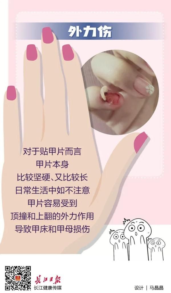 春节前,王玥美美地做了一款美甲,还特意选择贴了延长甲片让手指显得更为修长。不料,骑电动车时意外摔了一跤,“手指触地瞬间一阵剧痛,我一看好几个甲片翻起来了,有两个指头血直流。”
