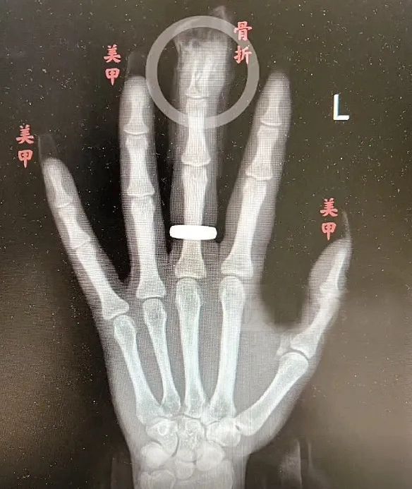 王女士甲片长度是正常指甲长度的2倍,又有一定向下的弧度,在摔倒的瞬间,冲击力较大,手指触地时指甲比手掌更早接触地面,再加上甲片被胶水牢牢固定,“就像个杠杆,直接掀翻指甲,还导致指骨骨折。”冯伟医生表示,如果没有美甲,伤害不会这么严重。